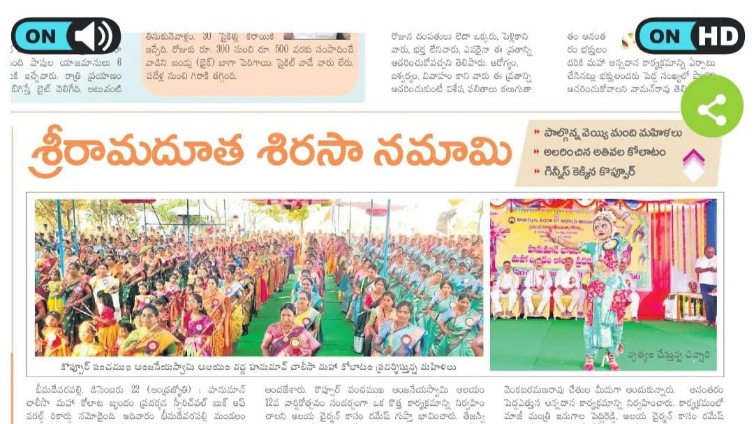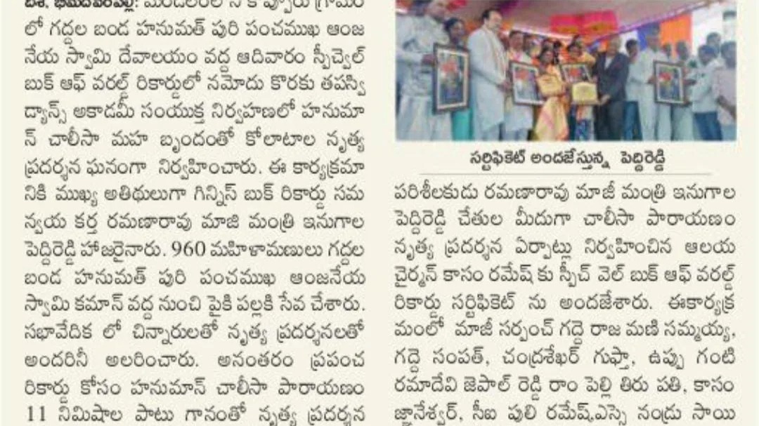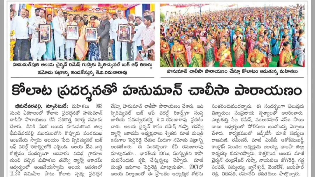 To meet desires of our precious talented Customers, our firm offers World Records Certification Services. This World Records Certification to support, recognize & register World wide Talents & Wonders in Variuos WORLD RECORDS ORGANIZATIONS, This service is reliable and available for patrons in the simplest way. We apply chargers for this service.#Mass #Hanuman #Chaleesa #with #960 #Female #Artists #on #Kolatam #into #SPIRITUAL #BOOK #OF #WORLD #RECORDS #Shri #Panchamukha #Anjaneya #Swamy #Devalayam #and #Swetha #Dance #Academy #achieved #the #Spiritual #Book #of #World #Records #for #the #Kolatam #with #960 #female #Artists #on #Hanuman #Chaleesa #at #Koppur (V) #Hanamkonda, #Telangana,#Bharat #on #22-12-2024.